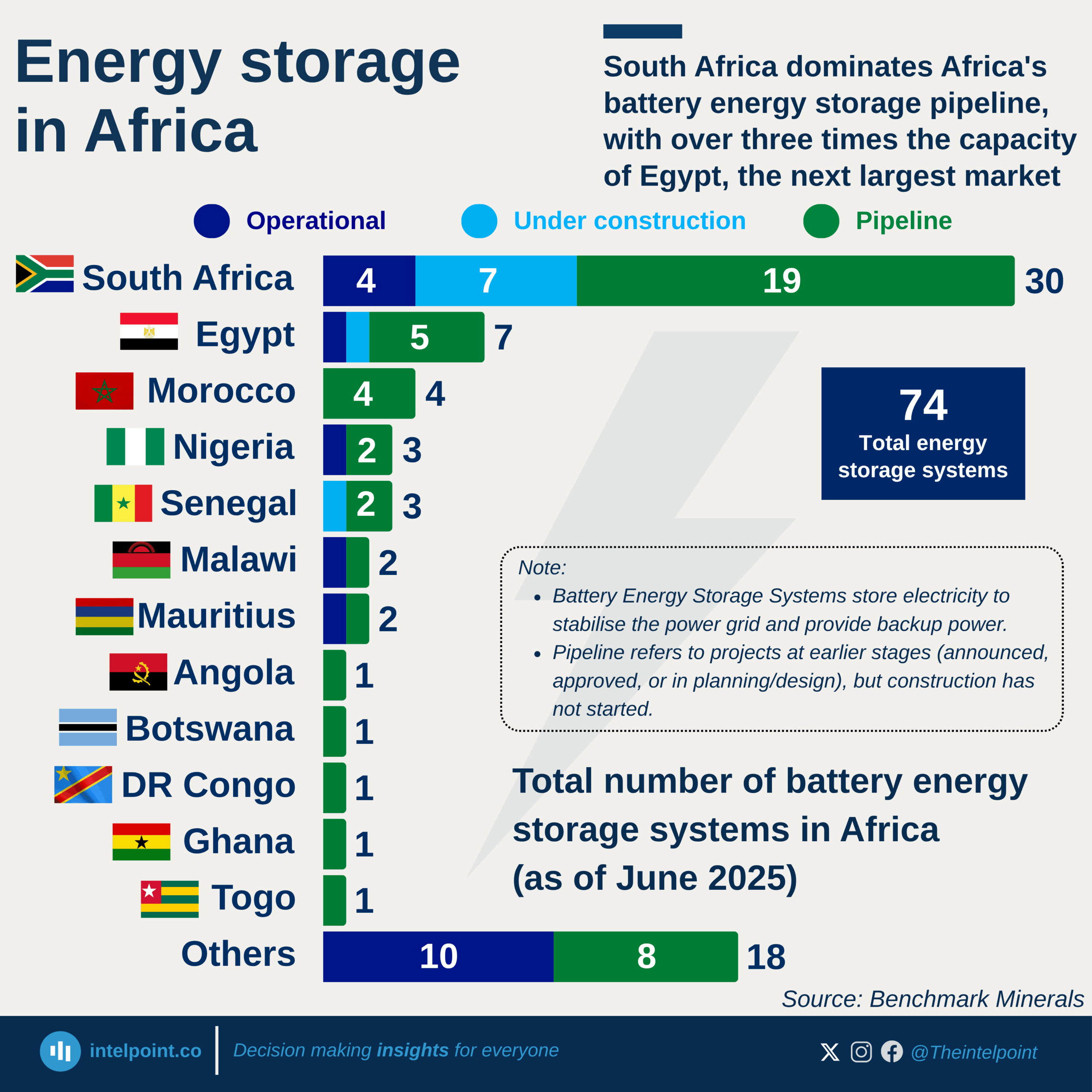 Who's leading: South Africa dominates with 30 storage systems and 11 GWh of proposed capacity, more than three times Egypt's pipeline. Egypt and Morocco represent the next wave, with storage helping smooth the integration of solar and wind into their national grids.