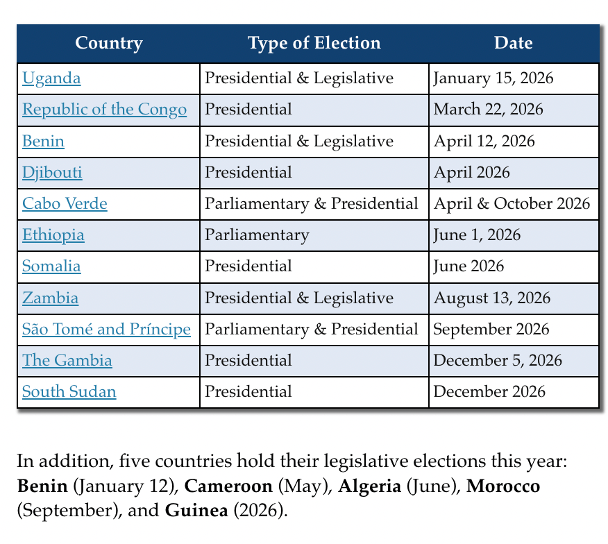 Africa has 11 national elections slated for 2026, spanning Ethiopia to Cabo Verde and SĂŁo TomĂ© and PrĂncipe.