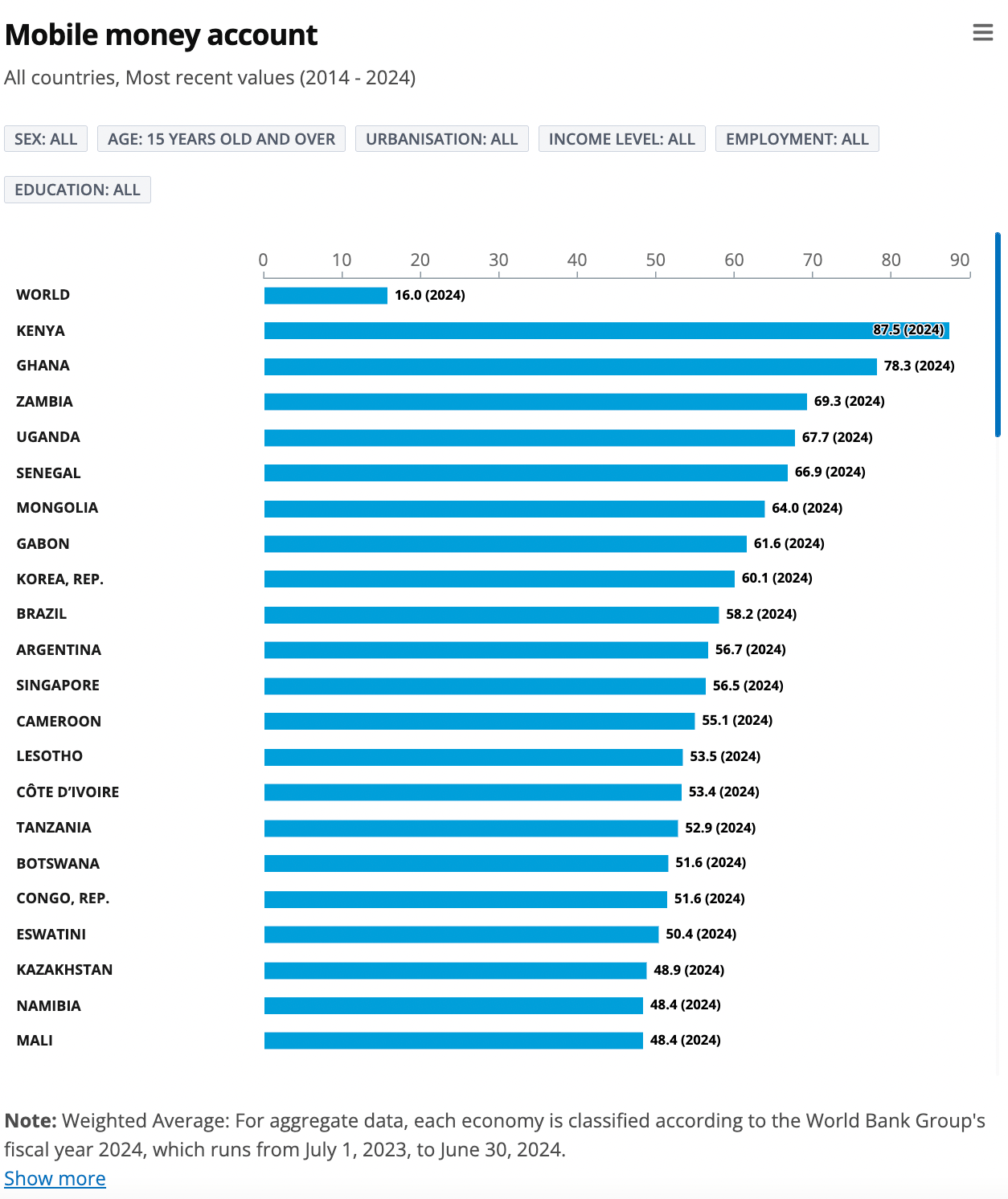My colleagues have been playing with World Bank data and I had to share. It shows—plain as day—how mobile money has become much of Africa’s de facto banking system. With few traditional bank or credit card users, millions of Africans now send and spend, save and borrow entirely through their phones. It’s one of the most powerful examples of leapfrog innovation anywhere.