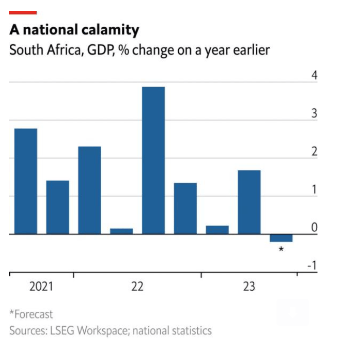 South African Recession. The Southern African giant’s economy contracted as its minerals and manufacturing sectors were dragged down by power cuts and failing railways — both state-owned sectors (Reuters).
