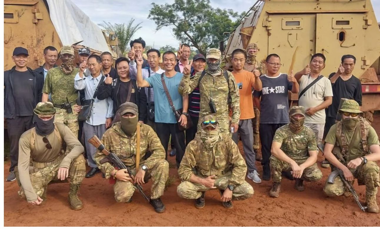 Source: South China Morning Post. Wagner fighters posing with evacuated Chinese miners who were at a mine near Bambari in the Central African Republic.