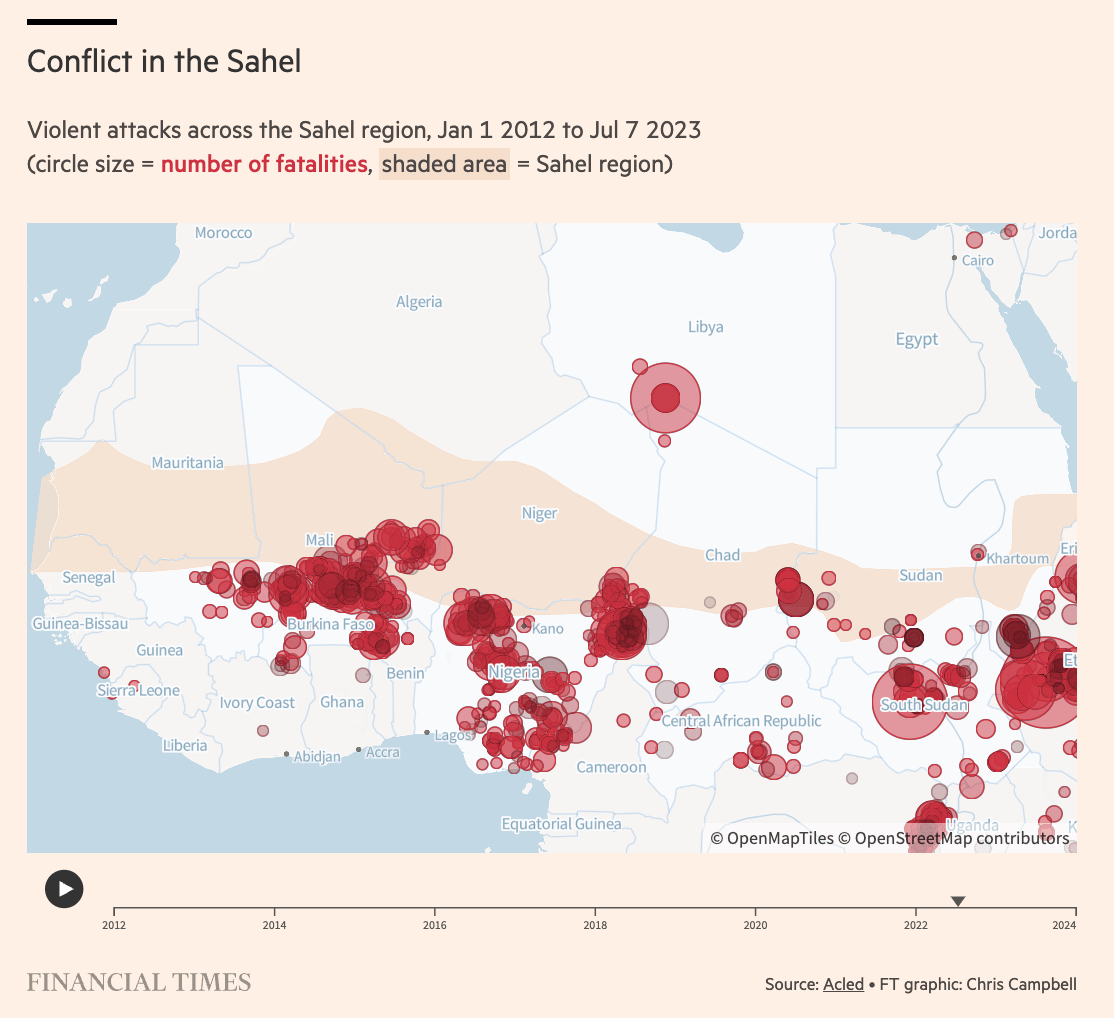Sudan. The spillover from the conflict risks worsening hostilities in an already volatile Sahel region, a corridor stretching from the Red Sea to the Atlantic (Financial Times).