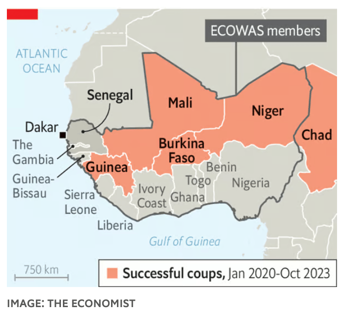 Senegal’s President Macky Sall asks if democracy can work in Africa’s coup-belt, warning that a “syndrome of chaos” threatens Senegal (The Economist).